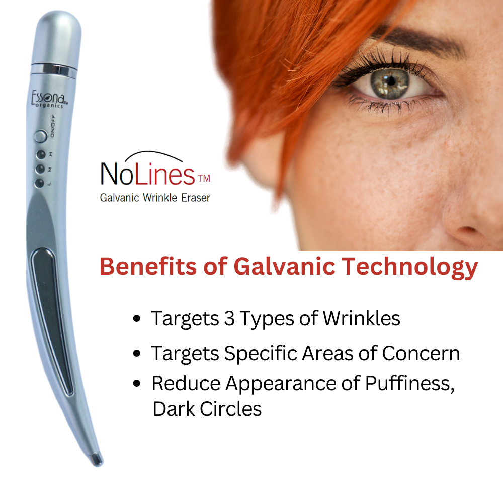 The No Lines™ Galvanic Wrinkle Eraser uses state-of-the-art technology originally developed in Silicon Valley. It uses galvanic microcurrent and ion activity to reverse the visible signs of aging by stimulating collagen in the skin, thereby gradually smoothing the skin and improving the appearance of fine lines, wrinkles, dark circles, eye puffiness and crow’s feet. The unique ergonomic shape of the No Lines™ Galvanic Wrinkle Eraser is specifically designed to target the delicate areas around the eyes to regain and sustain a more youthful, radiant appearance for life. There are 3 intensity settings - low, medium, high.
